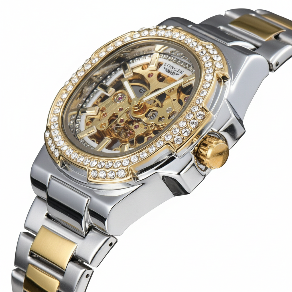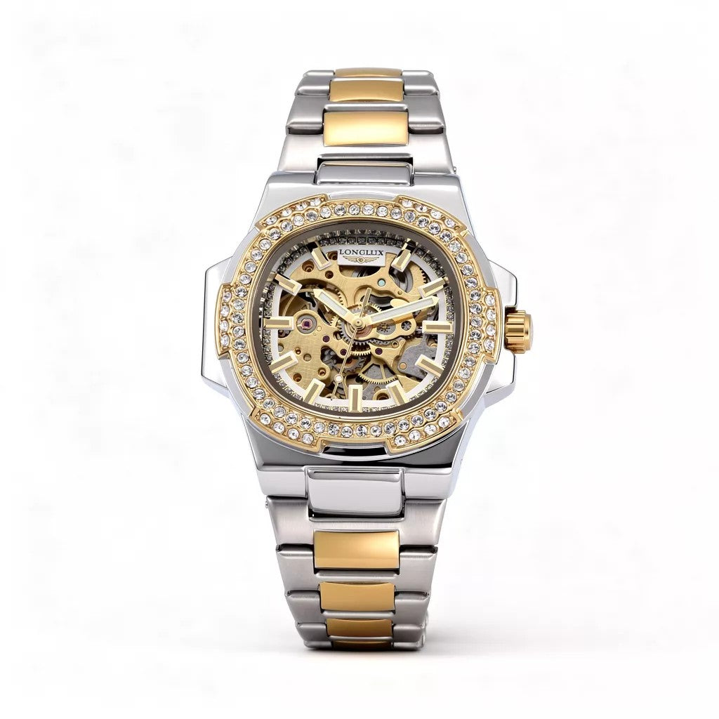 Elegância mecânica em seu pulso. Este relógio LONGLUX apresenta movimento automático de alta precisão com design oco exclusivo que revela a beleza da engenharia mecânica. Perfeito para quem aprecia a arte da relojoaria tradicional.