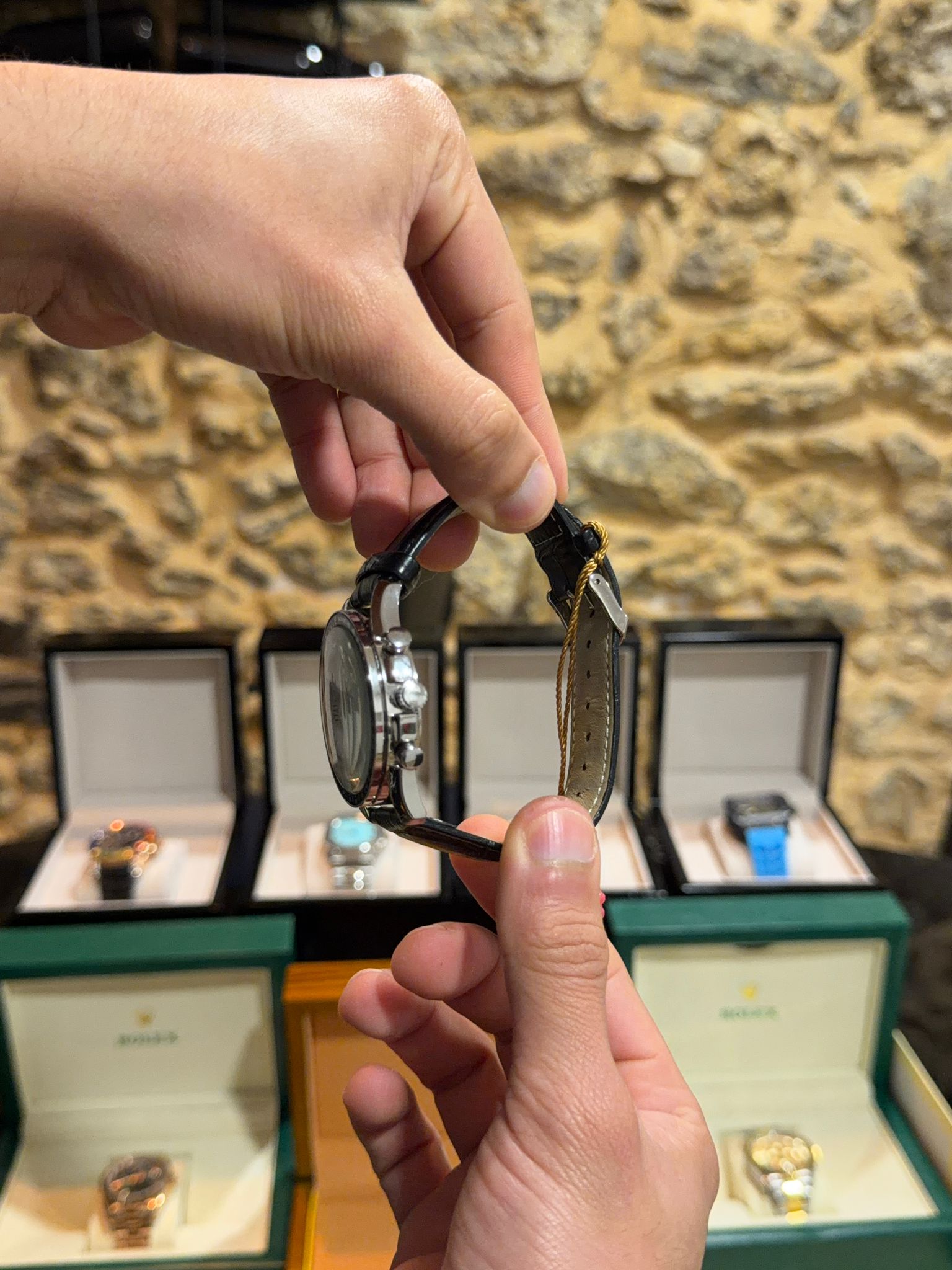 • Black stepped dial with applied metal indexes